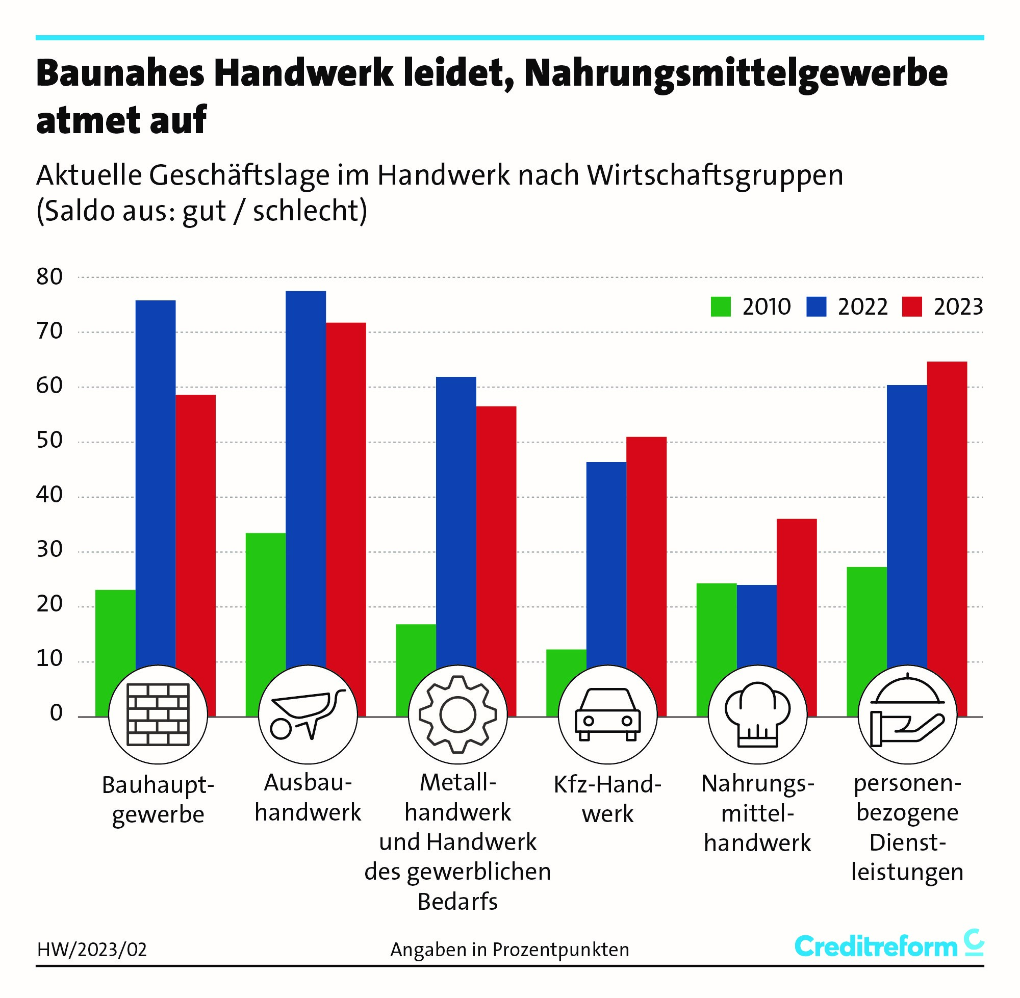 Zum Jahresbeginn befragt die Wirtschaftsauskunftei Creditreform traditionell Handwerksbetriebe zu ihrer Geschäftslage, zur Umsatzentwicklung und zur Auftragslage.