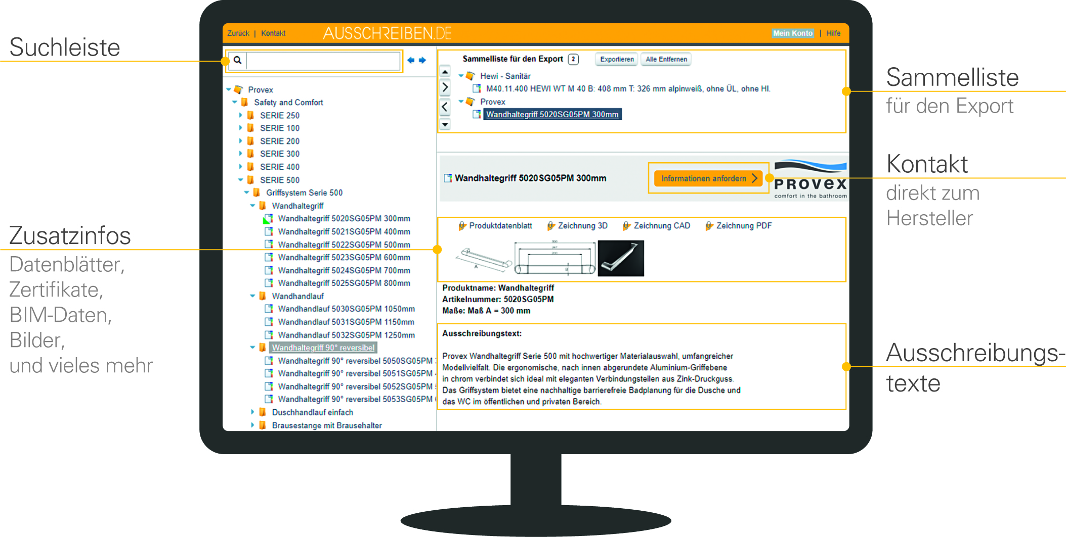 Die Ausschreibungstexte und Produktinformationen sind inhaltlich korrekt und aktuell – sie werden von den Herstellern selbst erstellt und gepflegt – und können direkt, schnell und korrekt in das gewünschte Dokument importiert werden. Je nach Softwarelösung geschieht dies per Drag & Drop oder durch optionale Importmöglichkeiten. Jeder Besucher von Ausschreiben.de hat freien Zugang und kann die Texte und relevante Informationen kostenlos nutzen. Durchschnittlich 9.000 Besucher täglich verwenden die Online-Plattform für Produktrecherchen, Ausschreibungen, Kalkulationen und Angebote.