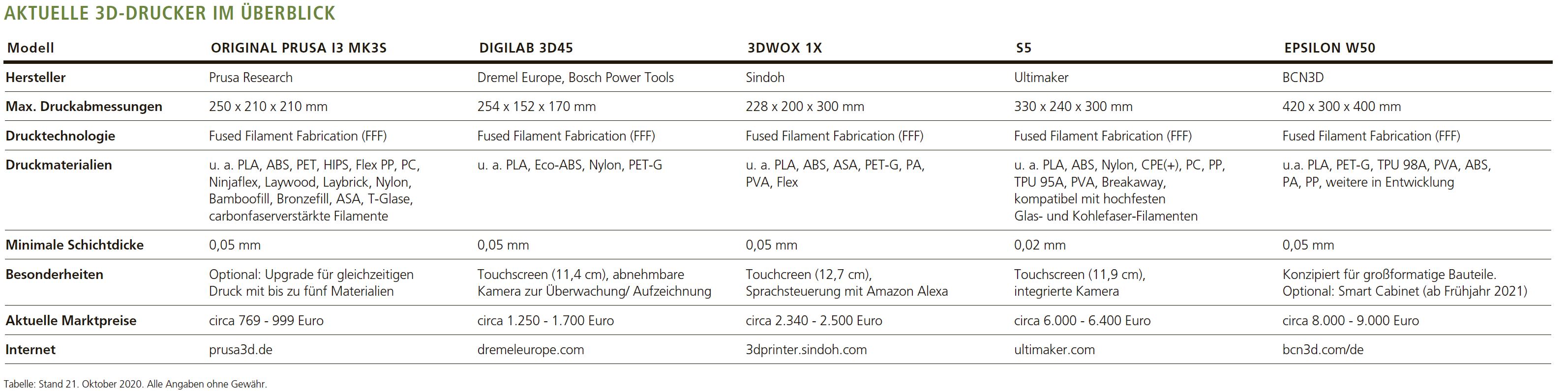 Die wirklichen Alleskönner unter den dreidimensionalen Druckern sind immer noch der Industrie vorbehalten und kosten nicht selten sechs- bis siebenstellige Summen. Dafür gibt es hier auch keine Grenzen bei Objektgrößen oder Materialien – sogar der Druck mit Metallen ist möglich. Erschwinglicher und vor allem für kleine Handwerksbetriebe interessant sind 3D-Printer, die verschiedene Arten von Kunststoffen als Druckmaterial nutzen.