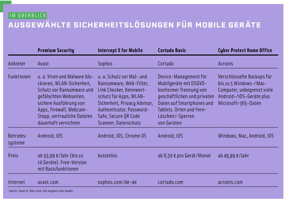 Auch Viren und Trojaner haben oft leichtes Spiel: Im Sommer 2023 hatte Stiftung Warentest verschiedene Sicherheitsapps geprüft – und dabei festgestellt, dass Google Play Protect und der Phishing-Schutz des Standard-Browsers Google Chrome nur unzureichenden Schutz bieten. Das beste Ergebnis erzielte eine kostenlose App: "Intercept X for Mobile" von Sophos. Eine gute Nachricht für Apple-Nutzer: Geräte mit iOS sind bauartbedingt sehr viel sicherer, sodass Virenscanner überflüssig sind. Trotzdem können Zusatzapps Sinn machen, um die Sicherheit in anderen Bereichen weiter zu erhöhen.