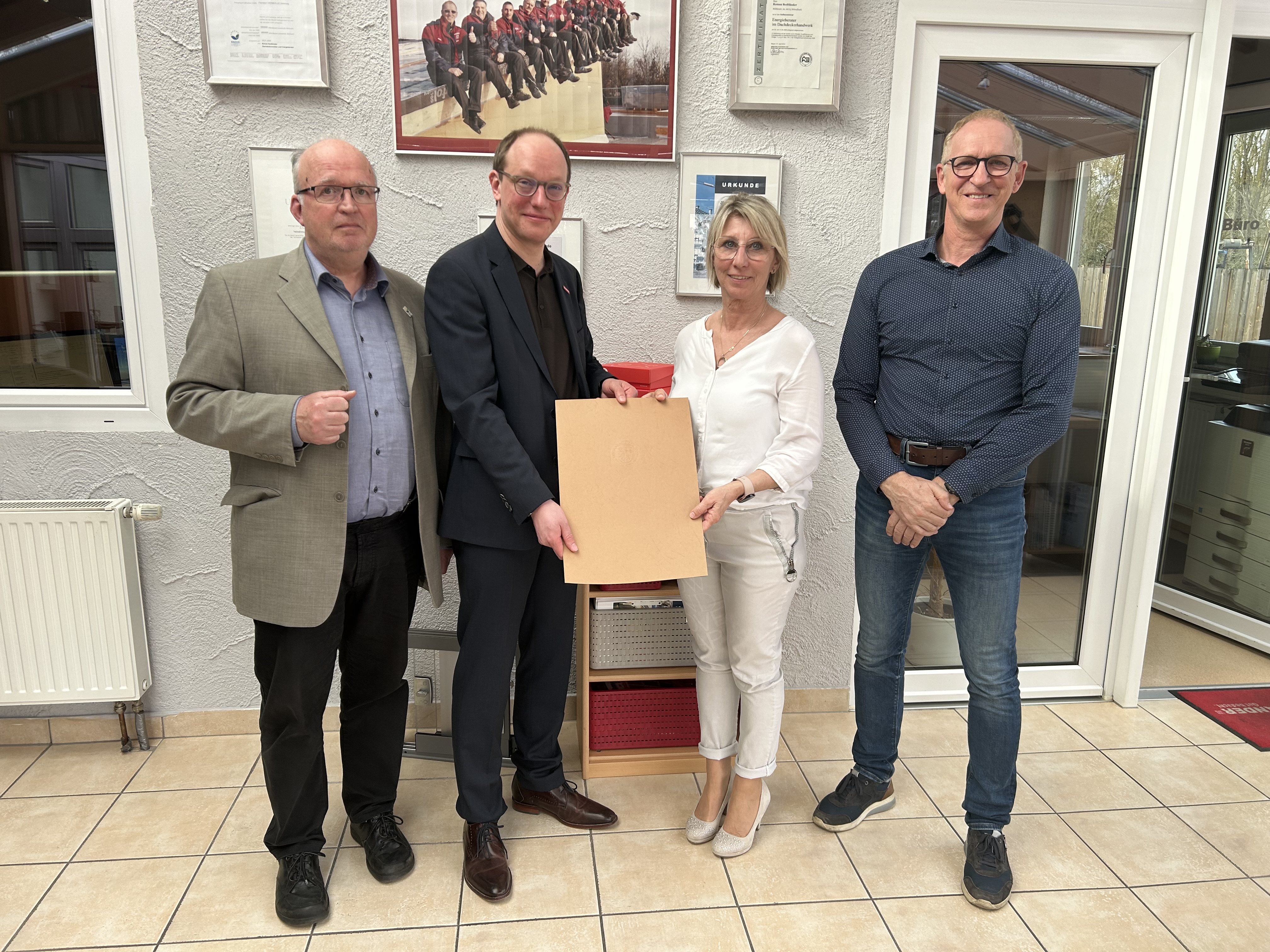 Urkundenübergabe bei der Helmut Dörr GmbH: (v.l.) Niklas Wamme, HWK-Hauptgeschäftsführer Jens Schmitt, Günter Wamme, Umweltberater Dr. Stephan Hirsch (Foto: © Handwerkskammer des Saarlandes)