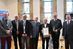 Klaus-Dieter Volger (3.v.r.) ist mit der höchsten Auszeichnung der Land- und Baumaschinen-Branche, der Goldenen Ehrennadel, ausgezeichnet worden. Die Laudation hielt Wolfgang Franck (Mitte). Zu den Gratulanten gehörten Frank Förster (l.), Marko Görkel (2.v.l.), Torsten Juch (3.v.l.), Dr. Michael Oelck (2.v.r.; Hauptgeschäftsführer des LandBauTechnik Bundesverbands) und der thüringische Ministerpräsident Bodo Ramelow. (Foto: © LandBauTechnik Landesinnung Thüringen)
