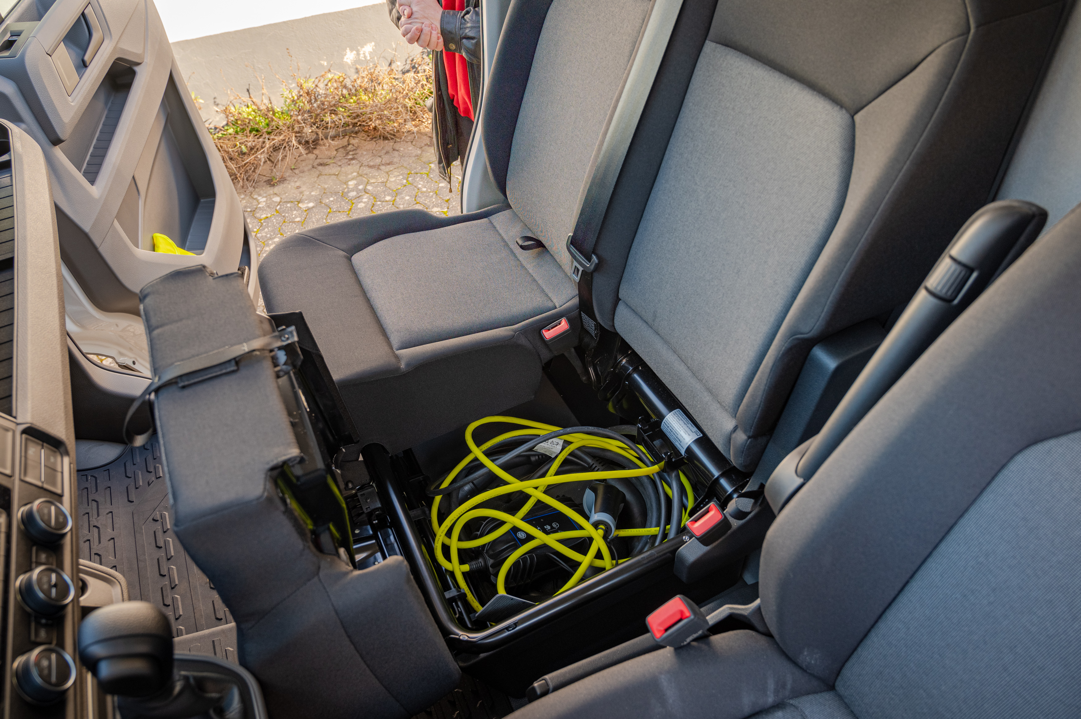 Wie alle E-Mobile tritt auch der e-Crafter ordentlich an. Sein Elektromotor leistet 100 kW / 136 PS, das maximale Drehmoment liegt bei 290 Newtonmetern und steht nahezu verzögerungsfrei zur Verfügung. Im e-Crafter ist der Motor, den VW auch im e-Golf einsetzt, mit einem einstufigen und speziell auf Nutzfahrzeuge ausgelegtem Automatik-Getriebe EQ 290 gekoppelt und treibt die Vorderräder an. In der Stadt ist ein zügiger Start an der Ampel ebenso problemlos drin wie Mitschwimmen im Verkehr. Nach dem Ortsschild sieht das dann schon anders aus, wir erinnern uns an die Höchstgeschwindigkeit von 90 km/h. Etwas ungewohnt sind die erzieherischen Maßnahmen von VWN, wenn man den e-Crafter in Betrieb nehmen und losfahren will. Das klappt nämlich nur dann, wenn die Türen geschlossen sind, der Fahrzeuglenker angeschnallt ist und auf die Bremse tritt. Nur dann startet der Motor, selbstverständlich geräuschlos. Im Zweifel hilft ein Blick auf die leuchtenden Anzeigen im Armaturenbrett des dreisitzigen Transporters. Unter der Doppelsitzbank für die Beifahrer finden die Ladekabel gut und rasch zugänglich ihren Platz.