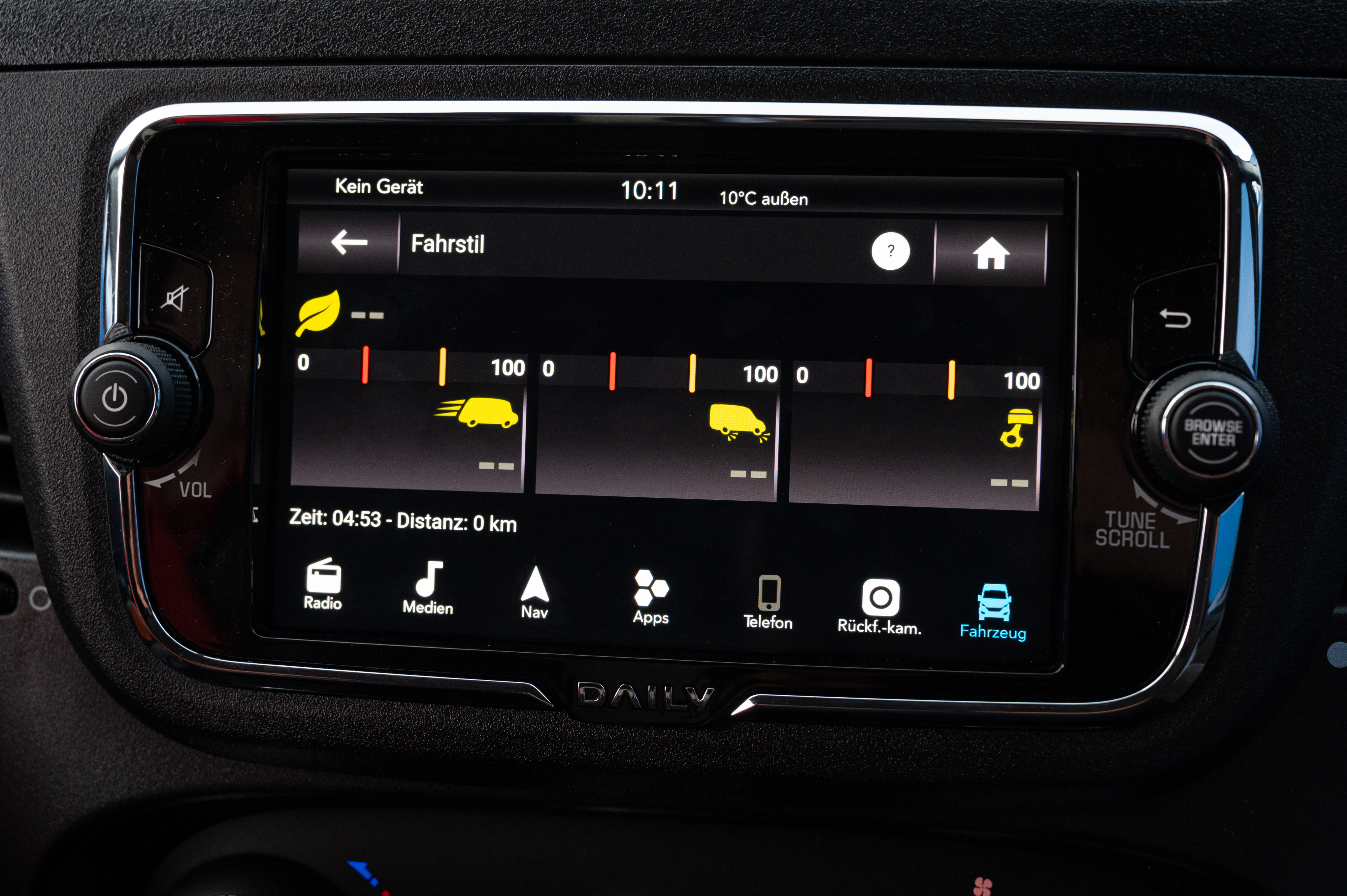 Mit 70 Litern ist der Inhalt des Dieseltanks für den Langstreckeneinsatz möglicherweise ein bisschen knapp geraten. Aber irgendwo mussten ja auch noch die 20 Liter für den AdBlue-Tank unterkommen. Bei schneller Autobahnfahrt liegt der Verbrauch des Daily um 13 Liter auf 100 Kilometer Fahrstrecke. Wer es weniger eilig hat, kann den Transporter aber auch mit unter zehn Liter Diesel bewegen.
