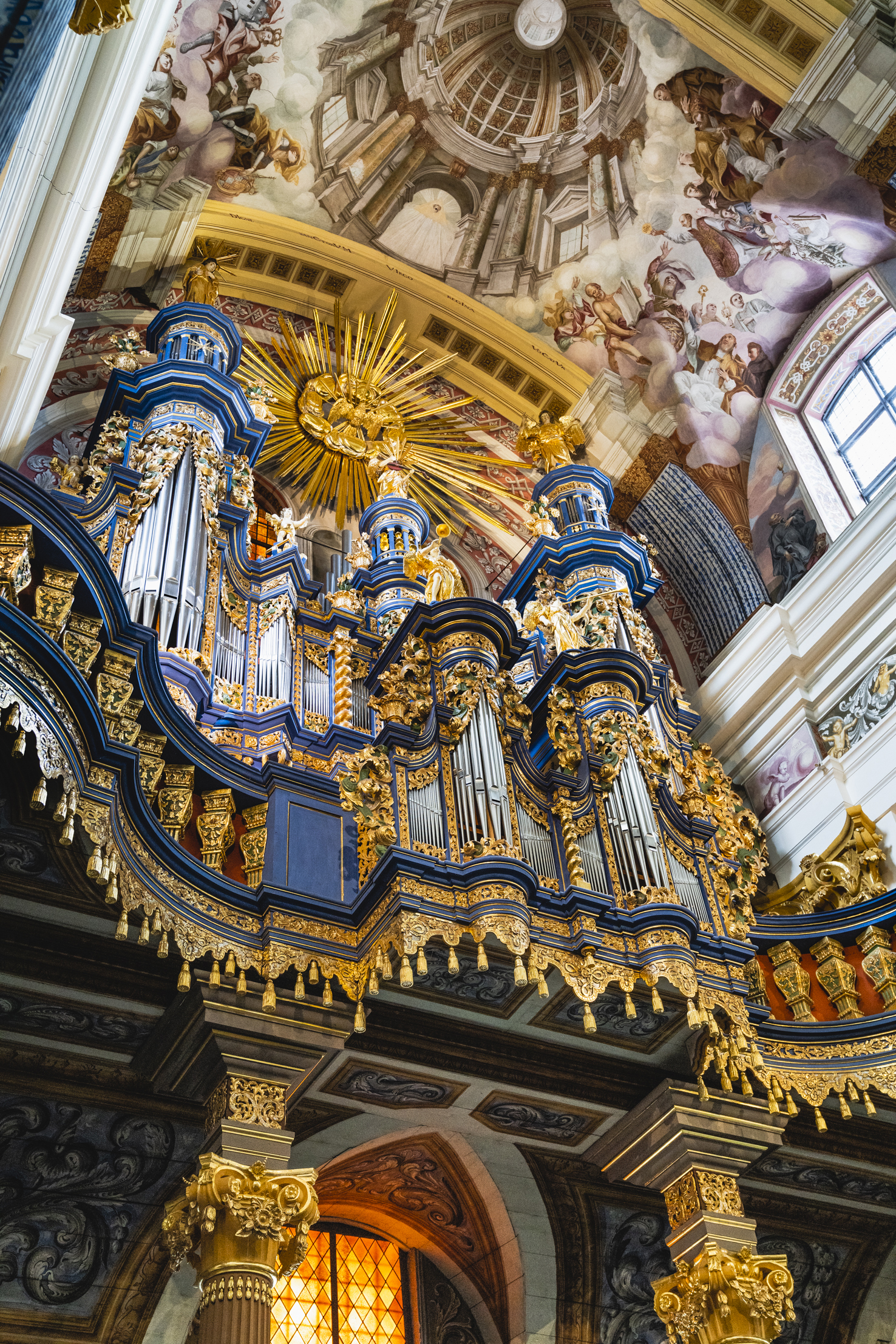 Die Barockkirche Heiligelinde. Herzstück ist die Orgel mit 3.960 Pfeifen und 40 Registern. Die Figuren der Orgel sind beweglich. Foto: © Siegfried Michael WagnerZuvor steht allerdings ein Mittagessen mit typischen Köstlichkeiten auf dem Programm. Dazu gehören natürlich die mit Hack gefüllten Kartoffelklöße und das obligatorische Gläschen Wodka. Angerburg ist ein touristisches Zentrum Masurens. Mit dem Mamerki-Bunker (Mauerwald) ist dort einer der besterhaltenen Bunker zu besichtigen. In dem dunklen Gemäuer sorgen nicht nur Kälte und Nässe für ein ehrfurchtvolles Frösteln. Eine Ausstellung erinnert an die dunkle Vergangenheit und die Vorbereitungen des Attentats. Irgendwie sind alle Teilnehmer erleichtert, dass ein Bus zurück in das warme und bequeme Hotel fährt.