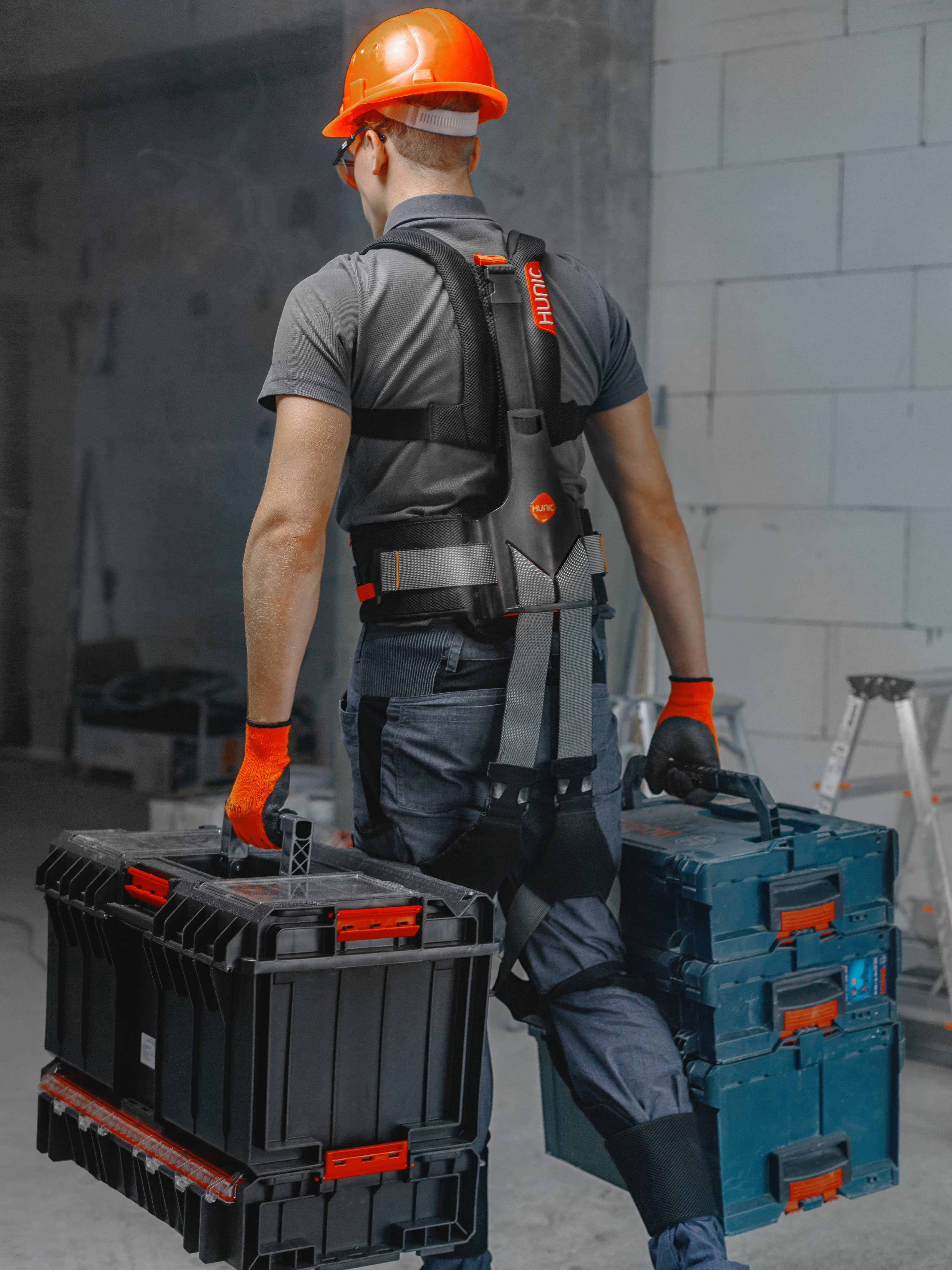 Die Exoskelette von Hunic sollen die Arbeit mit schweren Lasten erleichtern, aber ihre Träger auch zu einer rückenschonenden Körperhaltung anleiten. Der Hersteller wirbt mit einer Entlastung der Muskulatur um bis zu 25 Prozent.